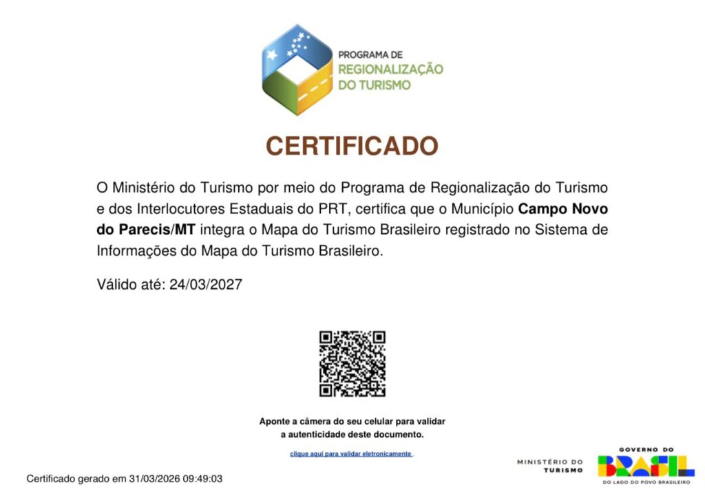 O município de Campo Novo do Parecis alcançou mais um importante marco para o fortalecimento do turismo local. A cidade foi oficialmente certificada pelo Ministério do Turismo como integrante do Mapa do Turismo Brasileiro, por meio do Programa de Regionalização do Turismo. A certificação reconhece que o município atende aos critérios exigidos pelo Governo Federal […]
