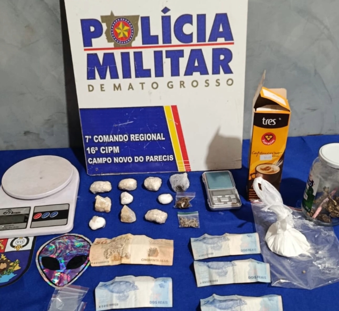 No endereço indicado, os policiais constataram que a porta do imóvel estava apenas encostada e que havia forte odor característico de drogas. Em busca domiciliar, foram localizados nove porções de substância análoga à pasta base de cocaína, uma porção grande de cocaína, duas porções de maconha, duas balanças de precisão, além de embalagens plásticas utilizadas para o acondicionamento de entorpecentes e R$ 58 em dinheiro.