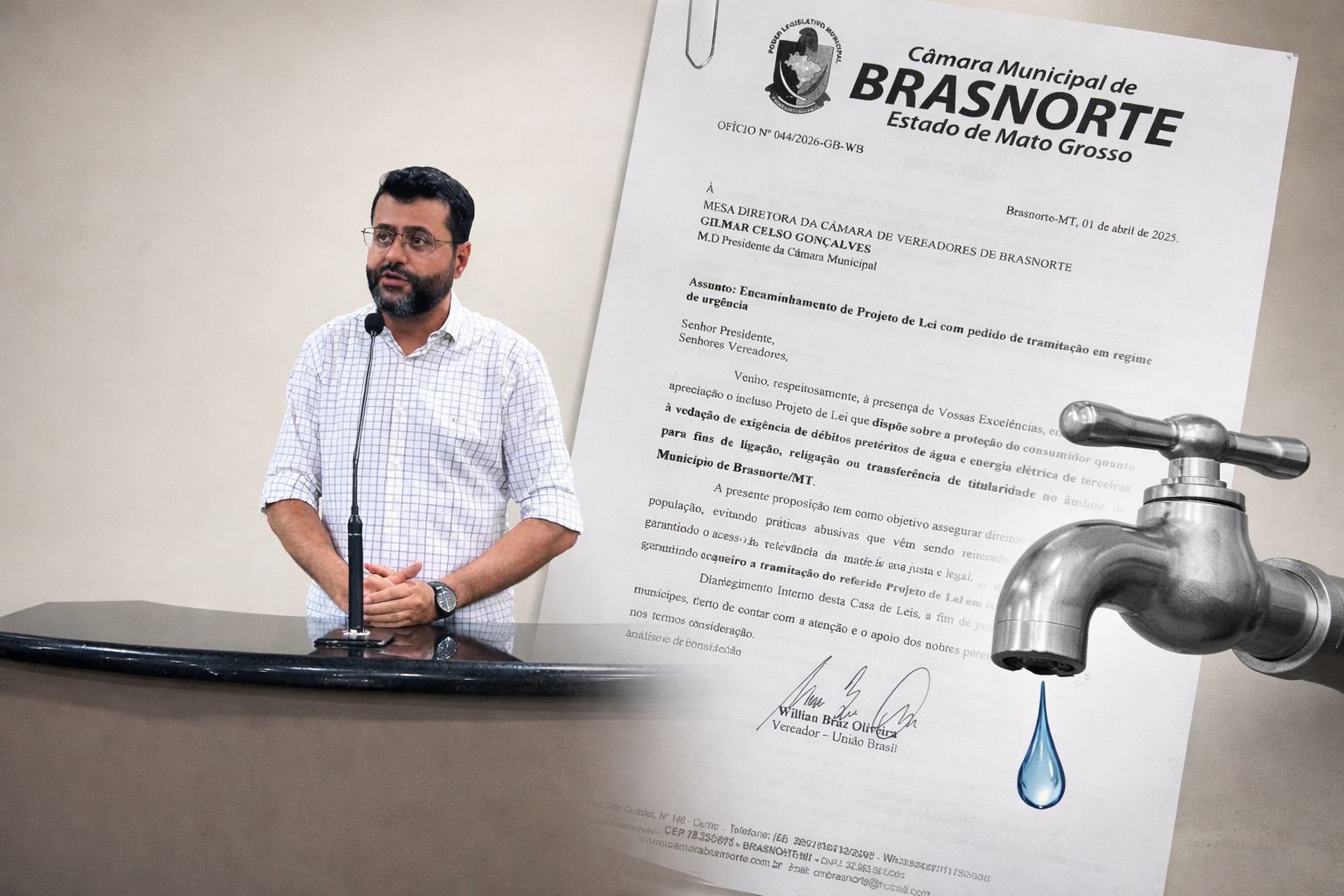 O vereador Willian Braz Oliveira (União Brasil) apresentou à Câmara Municipal de Brasnorte um Projeto de Lei que busca proteger consumidores contra a cobrança indevida de débitos antigos de água e energia elétrica deixados por terceiros.